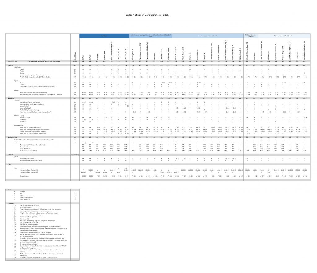 Der Test wurde auf der Basis des Stiftung Warentest Konzepts durchgeführt. Da ein Ledernotizbuch grundsätzlich aus (Leder-)hülle, Papier und System besteht wurden diese Kriterien untersucht und anhand des vereinfachten Schulnotensystems von 1 bis 5 bewertet und symbolisch dargestellt (++, +, 0, -, – -).